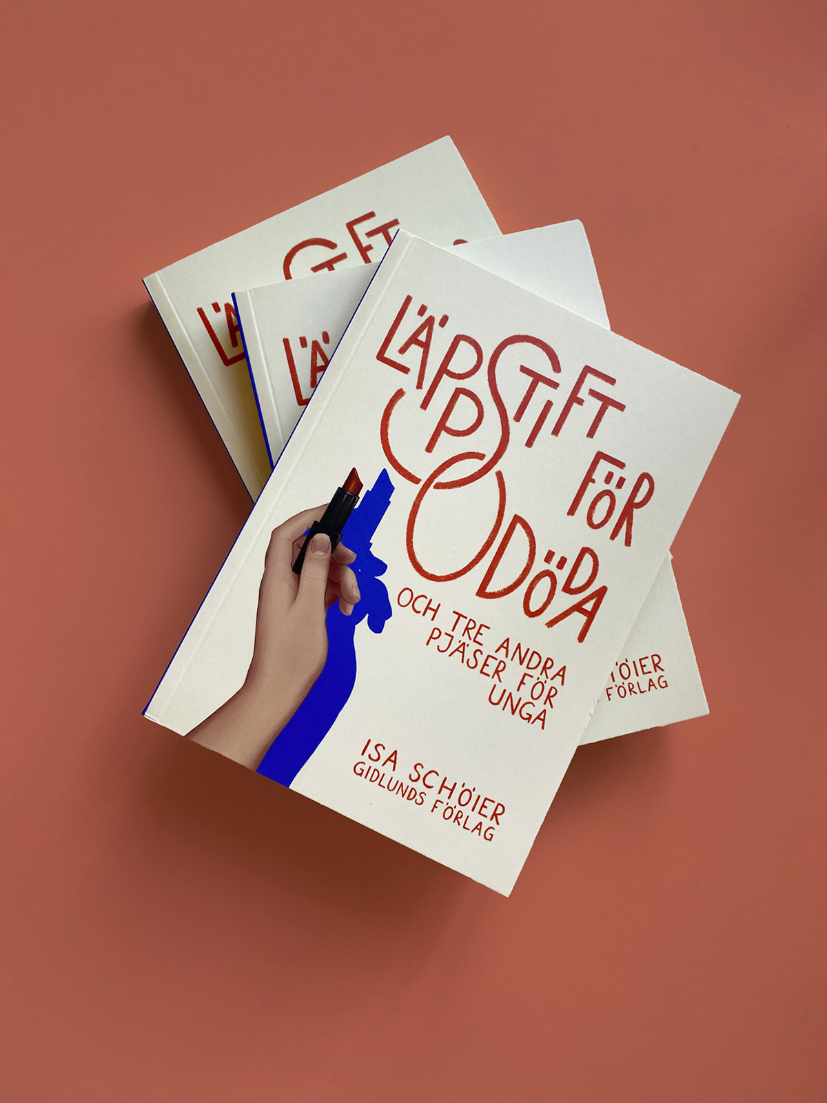 ✱ Läppstift för odöda och tre andra pjäser för unga är en dramatiksamling som riktar sig till en ung publik. Vi fick uppdraget att formge ett stilrent, ungdomligt och lekfullt omslag till denna samling. Boken är utgiven av Gidlunds förlag.